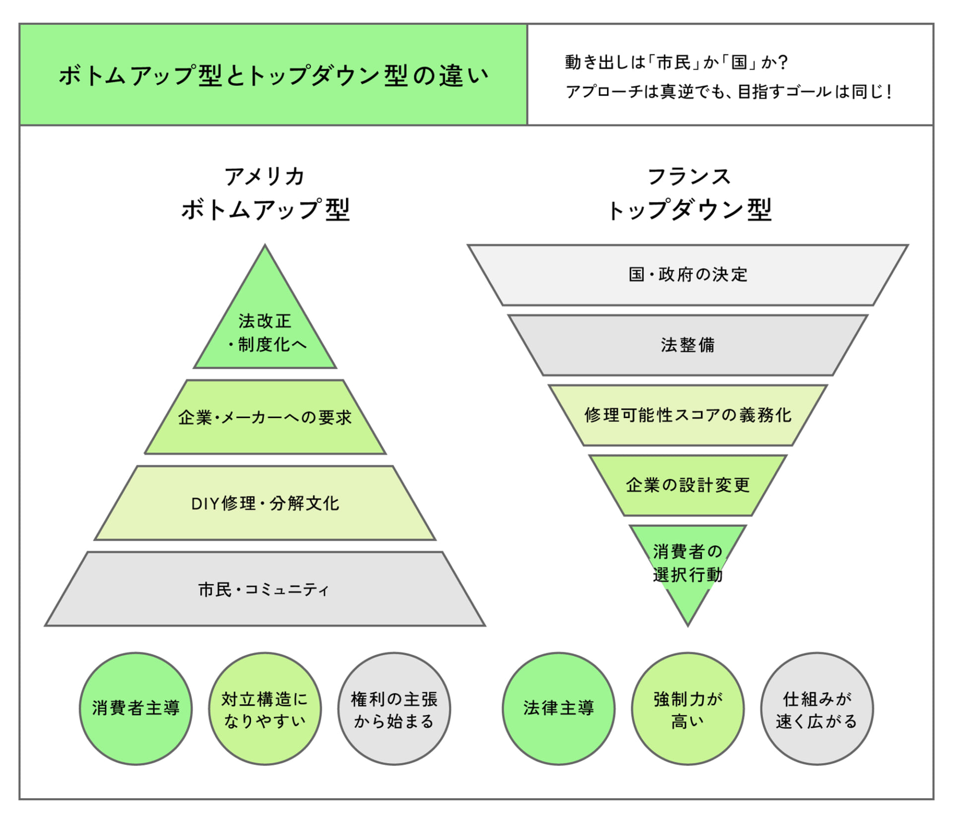 各国のゴールは同じ方向性で「消費者保護」と「環境問題」ですが、アプローチが全く異なります。